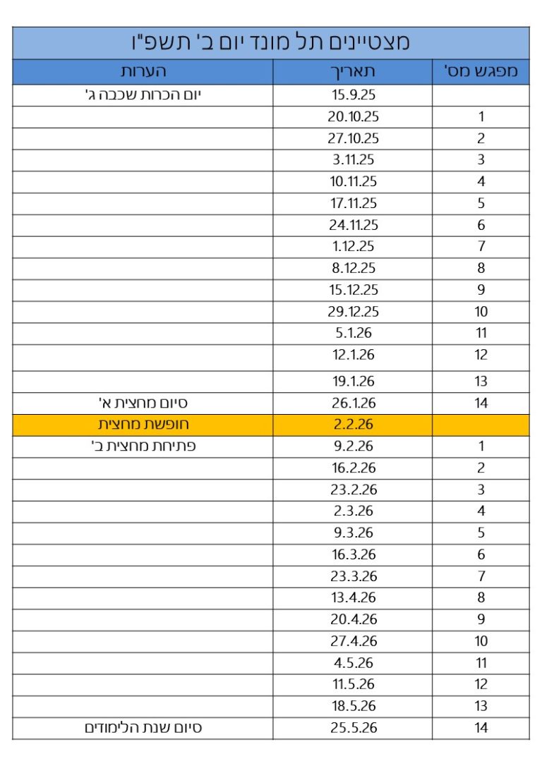 לוח הזמנים ראו כאן בהמשך את התאריכים של ימי הלימודים במרכז חופי"ם לאורך כל השנה (שני הסימסטרים) – בתוכניות המחוננים והמצטיינים. תאריכי ימי הלימודים - תכנית המצטיינים לו"ז - רופין התחלת לימודי מצטיינים ברופין ב- 19.10.25 לו"ז - תל מונד התחלת לימודי מצטיינים בתל מונד ב- 20.10.25 תאריכי ימי הלימודים - תכנית המחוננים תאריכי לימודים - כיתה ג' תאריכי לימודים - כיתה ד' תאריכי לימודים - כיתות ה' + ו' תאריכי לימודים - כיתות ז' + ח' + ט'